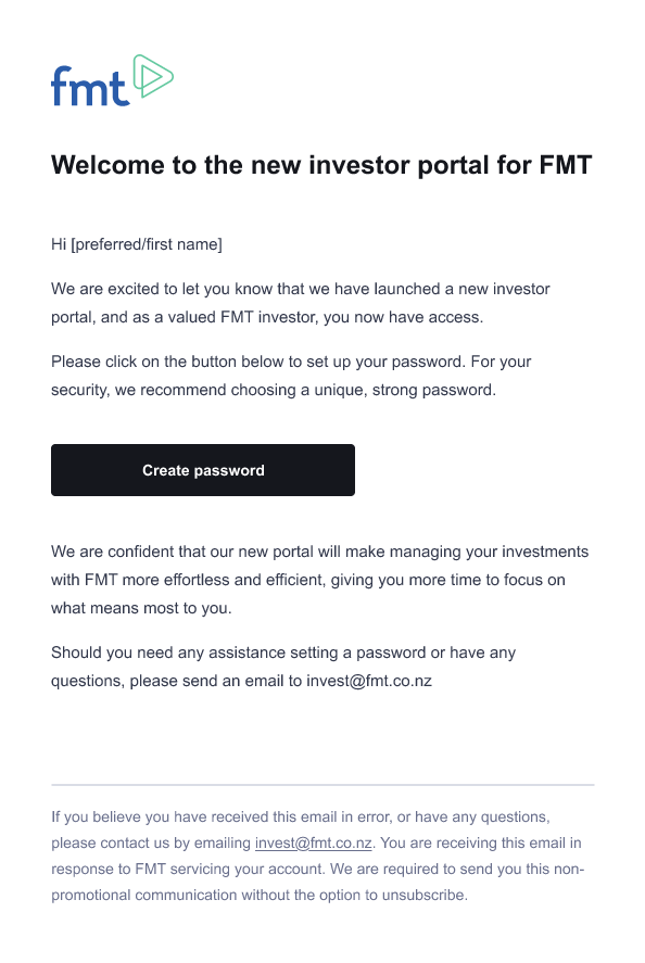 You will then be taken to FMT’s Investor Portal to log into your account and set a password.