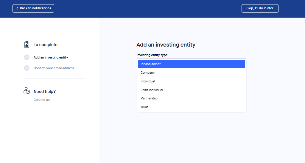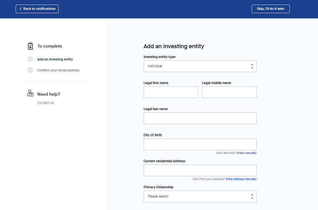 Here we chose an individual investing entity; the investing entity type you choose will decide which information we need you to provide to set up the entity.