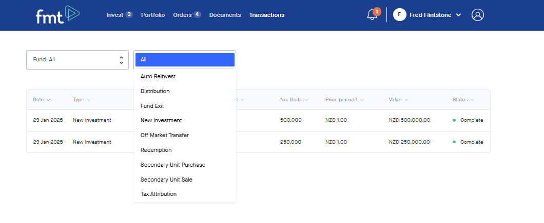 By clicking the transaction type in the dropdown menu, you can easily find the list of transactions you’re looking for.