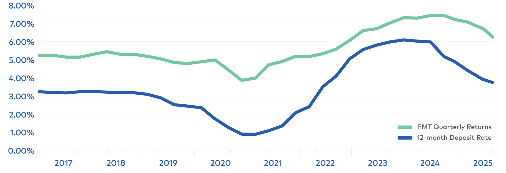 This graph shows the historical annualised pre-tax (after fees & expenses) quarterly distribution rates for the First Mortgage Trust Group Investment Fund versus the average 12-month bank term deposit rate since 2017.